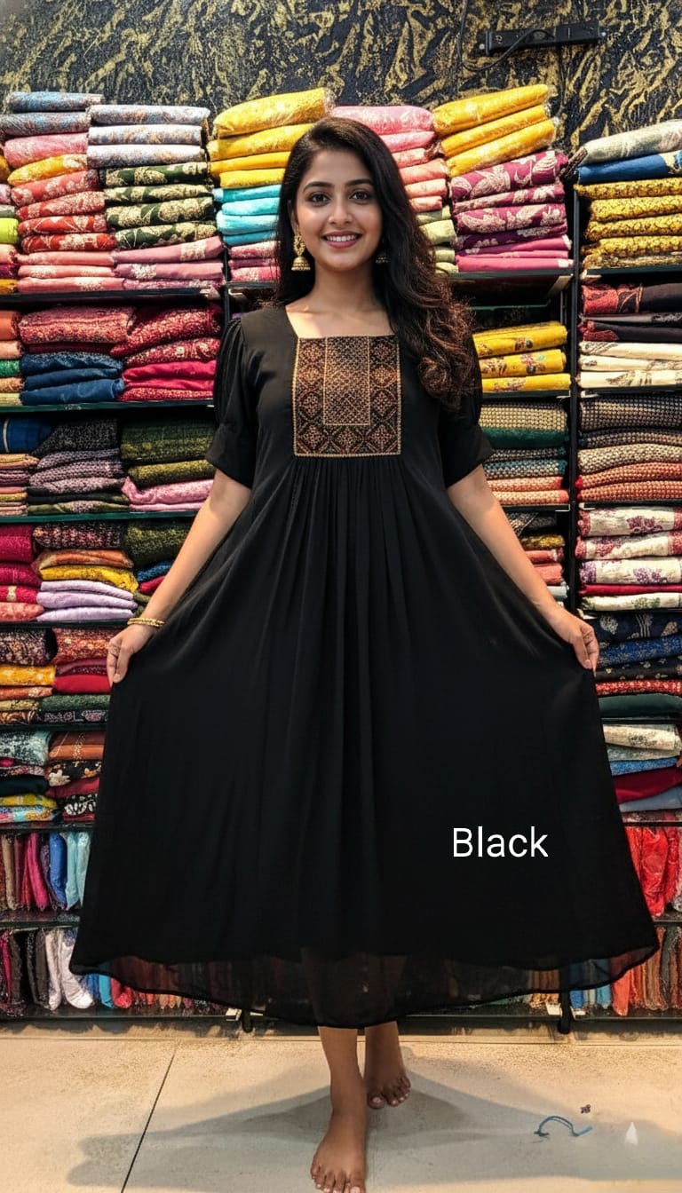 *_Heavy pleated Golden embroidery patch Square neck A line puff sleeve_*
